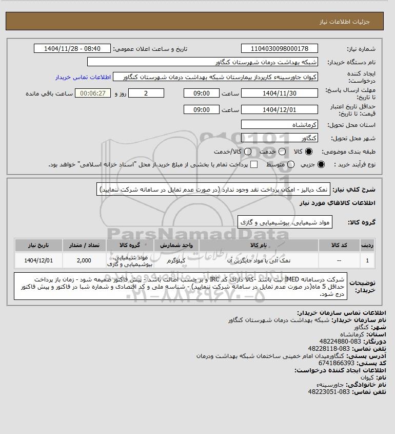شرح کلی نیاز: نمک دیالیز - امکان پرداخت نقد وجود ندارد (در صورت عدم تمایل در سامانه شرکت ننمایید)