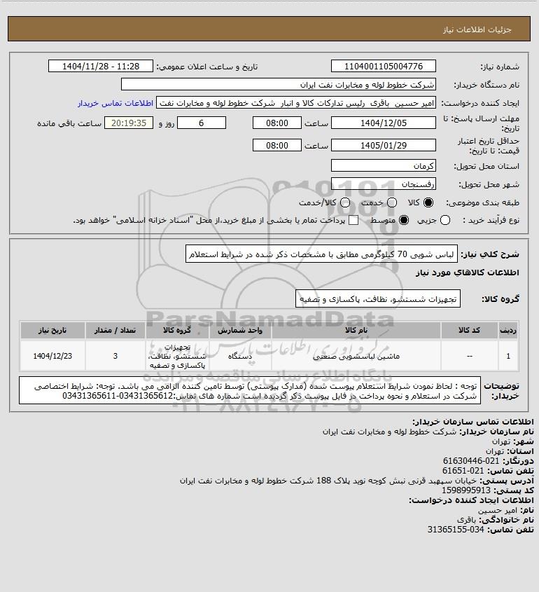استعلام لباس شویی 70 کیلوگرمی مطابق با مشخصات ذکر شده در شرایط استعلام, استعلام لباس شویی 70 کیلوگرمی مطابق با مشخصات ذکر شده در شرایط استعلام