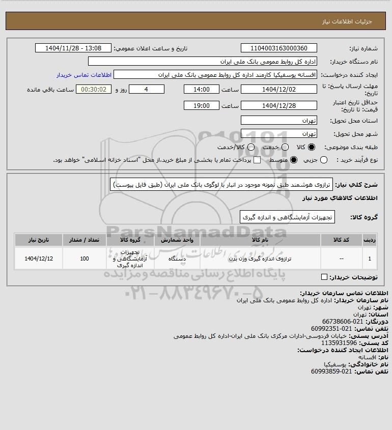 شرح کلی نیاز: ترازوی هوشمند طبق نمونه موجود در انبار با لوگوی بانک ملی ایران (طبق فایل پیوست)