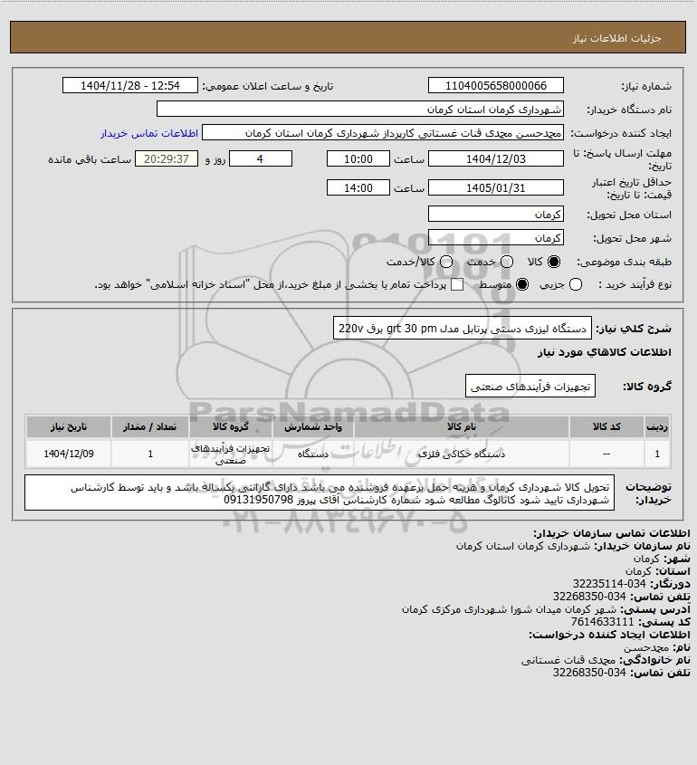 شرح کلی نیاز: دستگاه لیزری دستی پرتابل مدل grt 30 pm برق 220v