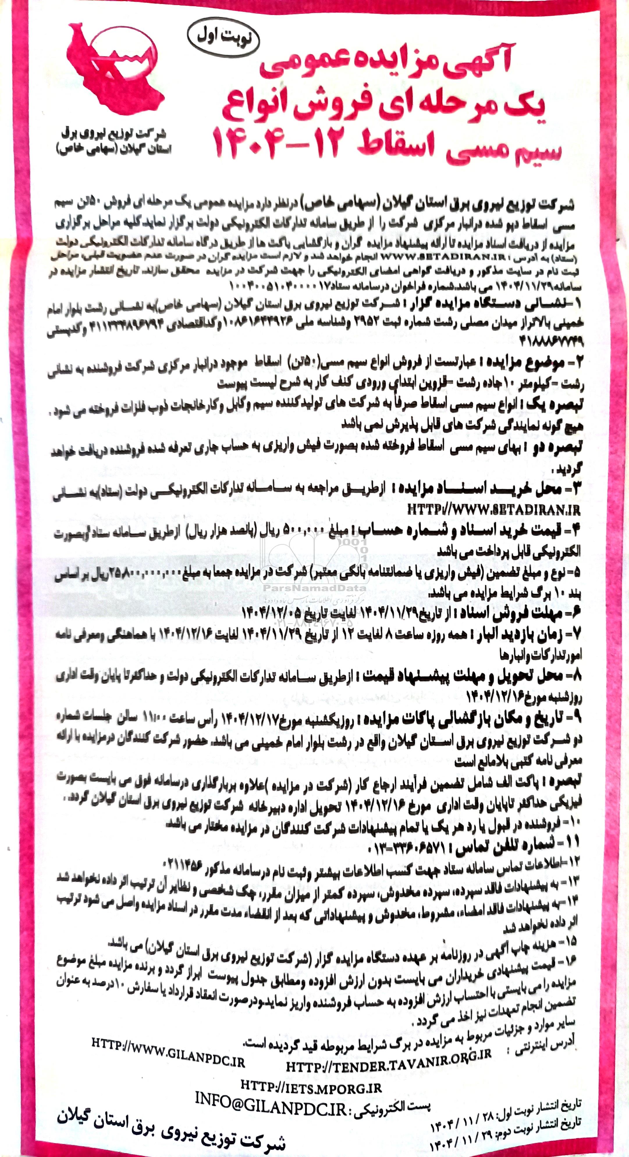 آگهی مزایده عمومی یک مرحله ای فروش انواع سیم مسی اسقاط 12 - 1404 نوبت اول