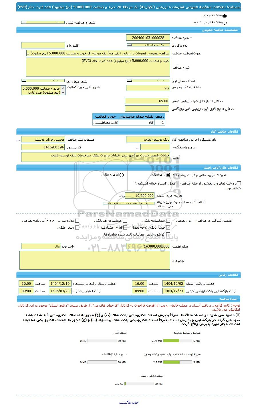 | شرح مناقصه | خرید و ضمانت 5.000.000 (پنج میلیون) عدد کارت خام (PVC) | ||||||||