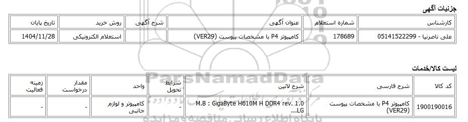 علی ناصرنیا - 05141522299178689کامپیوتر P4 با مشخصات پیوست (VER29)استعلام الکترونیکی1404/11/28