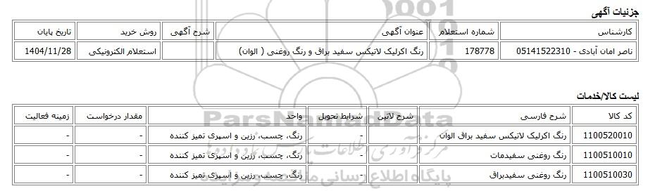 ناصر امان آبادی - 05141522310178778رنگ اکرلیک لاتیکس سفید براق و رنگ روغنی ( الوان)استعلام الکترونیکی1404/11/28