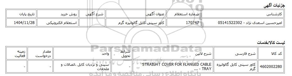 | امیرحسین اسعدی نژاد - 05141522302 | 170747 | کاور سینی کابل گالوانیزه گرم | استعلام الکترونیکی | 1404/11/28 |