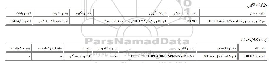 استعلام الکترونیکی فنر هلی کویل M16x2*پیوست دقت شود*, استعلام الکترونیکی، فنر هلی کویل M16x2*پیوست دقت شود*