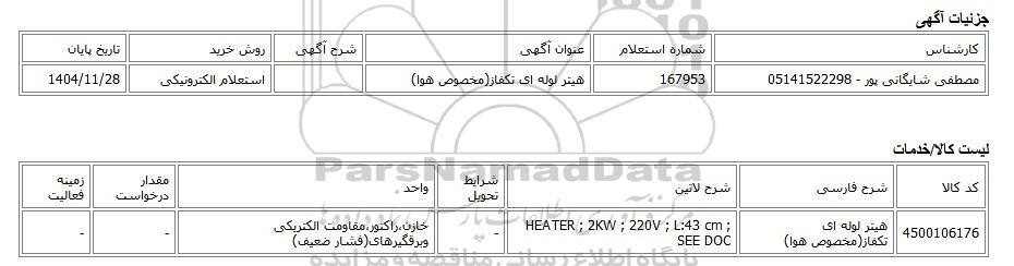 | مصطفی شایگانی پور - 05141522298 | 167953 | هیتر لوله ای تکفاز(مخصوص هوا) | استعلام الکترونیکی | 1404/11/28 |