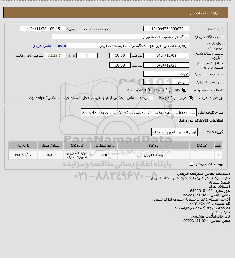 | 1 | -- | پوشه مقوایی | عدد | لوازم التحریر و تجهیزات اداری | 10,000 | 1404/12/07 |