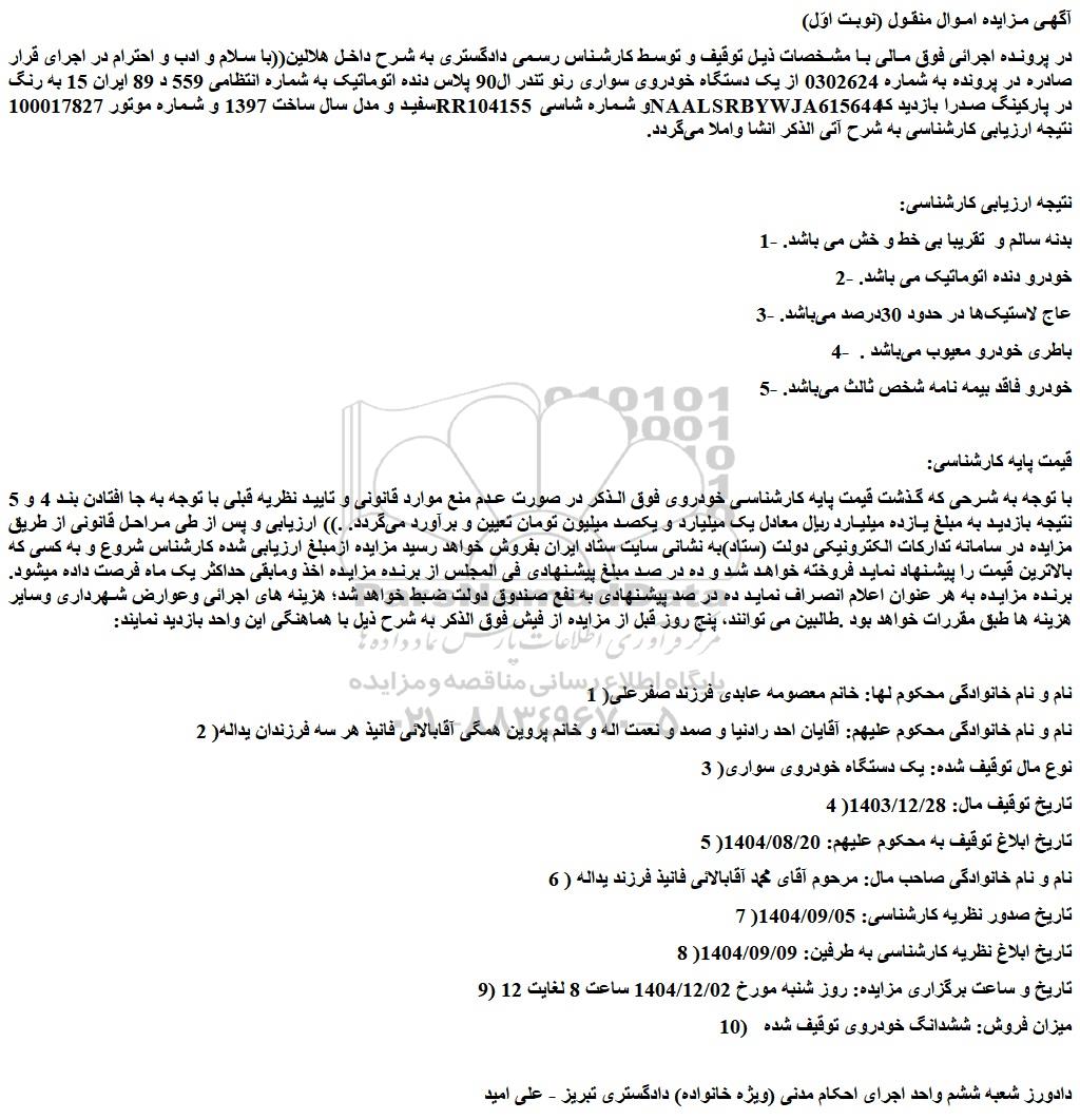 در پرونده اجرائی فوق مالی با مشخصات ذیل توقیف و توسط کارشناس رسمی دادگستری به شرح داخل هلالین((با سلام و ادب و احترام در اجرای قرار صادره در پرونده به شماره 0302624 از یک دستگاه خودروی سواری رنو تندر ال90 پلاس دنده اتوماتیک به شماره انتظامی 559 د 89 ایران 15 به رنگ سفید و مدل سال ساخت 1397 و شماره موتور 100017827rr104155 و شماره شاسی naalsrbywja615644 در پارکینگ صدرا بازدید که نتیجه ارزیابی کارشناسی به شرح آتی الذکر انشا واملا می گردد.