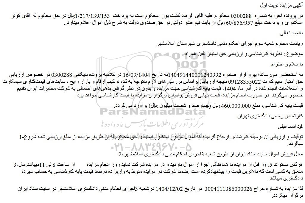 در پرونده اجرا به شماره 0300288 محکو م علیه آقای فرهاد کشت پور محکوم است به پرداخت 1/217/139/153ریال در حق محکوم له اقای کوثر اسکندری و پرداخت مبلغ 60/856/957 ریال از بابت نیم عشر دولتی در حق صندوق دولت به شرح ذیل اموال اعلام میدارد..