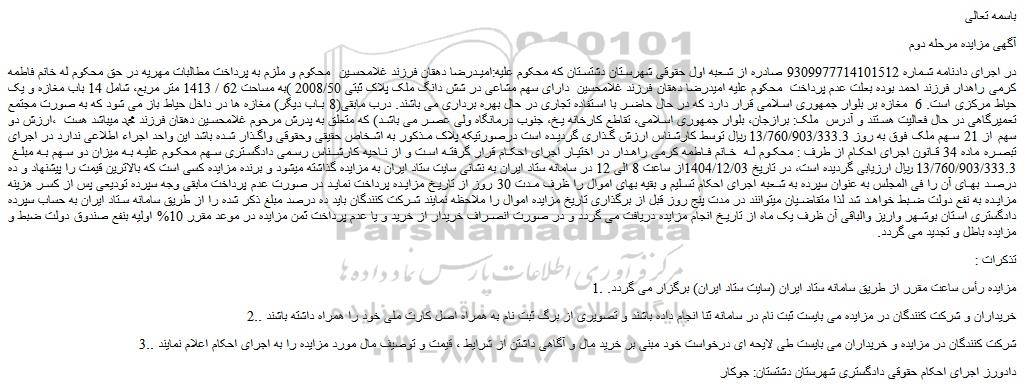 در اجرای دادنامه شماره 9309977714101512 صادره از شعبه اول حقوقی شهرستان دشتستان که محکوم علیه:امیدرضا دهقان فرزند غلامحسین محکوم و ملزم به پرداخت مطالبات مهریه در حق محکوم له خانم فاطمه کرمی راهدار فرزند احمد بوده بعلت عدم پرداخت محکوم علیه امیدرضا دهقان فرزند غلامحسین دارای سهم مشاعی در شش دانگ ملک پلاک ثبتی 2008/50 )به مساحت 62 / 1413 متر مربع، شامل 14 باب مغازه و یک حیاط مرکزی است. 6 مغازه بر بلوار جمهوری اسلامی قرار دارد که در حال حاضر با استفاده تجاری در حال بهره برداری می باشند. درب مابقی(8 باب دیگر) مغازه ها در داخل حیاط باز می شود که به صورت مجتمع تعمیرگاهی در حال فعالیت هستند و آدرس ملک: برازجان، بلوار جمهوری اسلامی، تقاطع کارخانه یخ، جنوب درمانگاه ولی عصر می باشد) که متعلق به پدرش مرحوم غلامحسین دهقان فرزند محمد میباشد هست ،ارزش دو سهم از 21 سهم ملک فوق به روز 13/760/903/333.3 ریال توسط کارشناس ارزش گذاری گردیده است درصورتیکه پلاک مذکور به اشخاص حقیقی وحقوقی واگذار شده باشد این واحد اجراء اطلاعی ندارد در اجرای تبصره ماده 34 قانون اجرای احکام از طرف : محکوم له خانم فاطمه کرمی راهدار در اختیار اجرای احکام قرار گرفته است و از ناحیه کارشناس رسمی دادگستری سهم محکوم علیه به میزان دو سهم به مبلغ 13/760/903/333.3 ریال ارزیابی گردیده است، در تاریخ 1404/12/03از ساعت 8 الی 12 در سامانه ستاد ایران به نشانی سایت ستاد ایران به مزایده گذاشته میشود و برنده مزایده کسی است که بالاترین قیمت را پیشنهاد و ده درصد بهای آن را فی المجلس به عنوان سپرده به شعبه اجرای احکام تسلیم و بقیه بهای اموال را ظرف مدت 30 روز از تاریخ مزایده پرداخت نماید در صورت عدم پرداخت مابقی وجه سپرده تودیعی پس از کسر هزینه مزایده به نفع دولت ضبط خواهد شد لذا متقاضیان میتوانند در مدت پنج روز قبل از برگذاری تاریخ مزایده اموال را ملاحظه نمایند شرکت کنندگان باید ده درصد مبلغ ذکر شده را از طریق سامانه ستاد ایران به حساب سپرده دادگستری استان بوشهر واریز والباقی آن ظرف یک ماه از تاریخ انجام مزایده دریافت می گردد و در صورت انصراف خریدار از خرید و یا عدم پرداخت ثمن مزایده در موعد مقرر 10% اولیه بنفع صندوق دولت ضبط و مزایده باطل و تجدید می گردد.