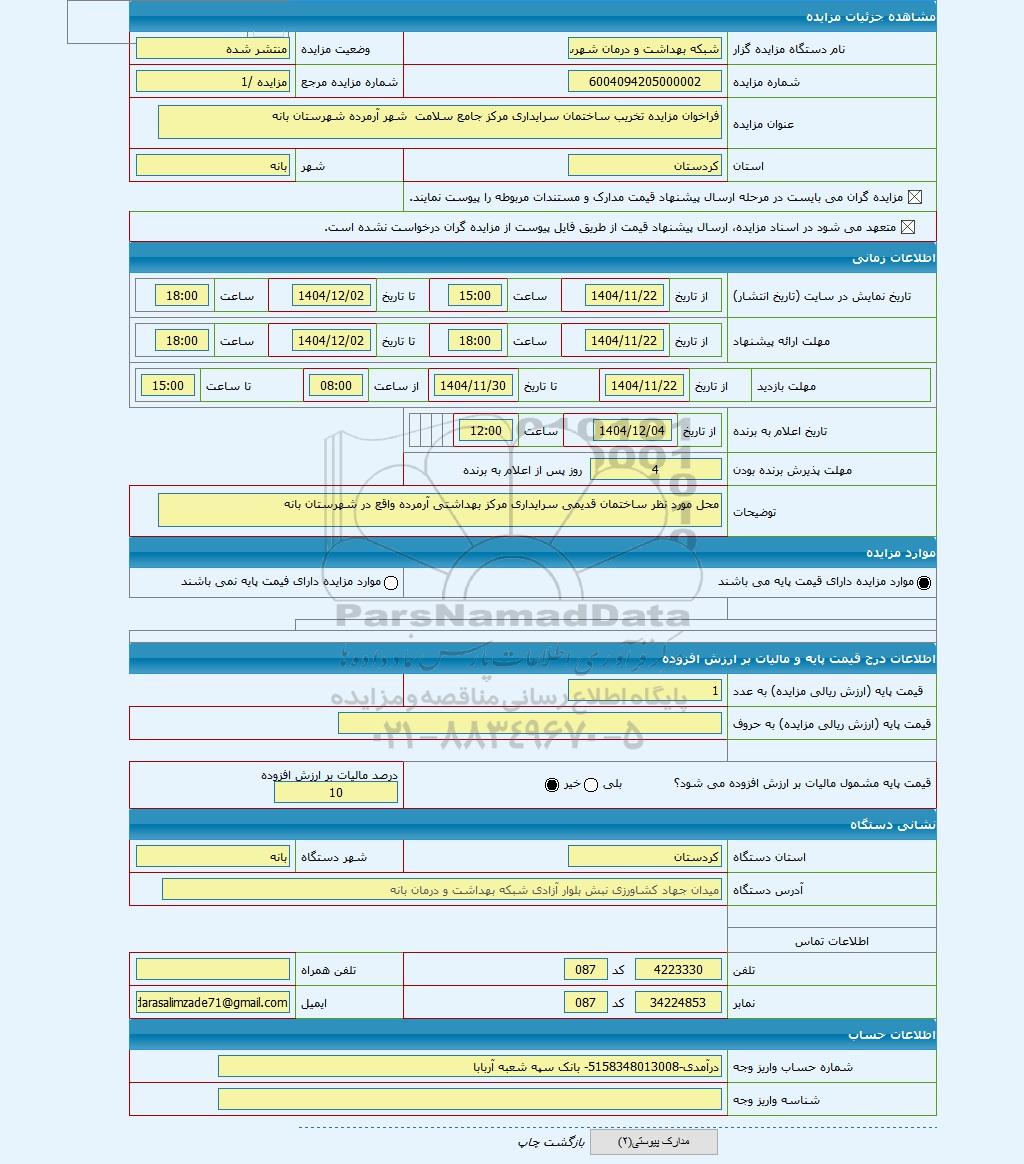 مزایده فراخوان مزایده تخریب ساختمان سرایداری مرکز جامع سلامت شهر آرمرده شهرستان بانه, مزایده ، فراخوان مزایده تخریب ساختمان سرایداری مرکز جامع سلامت شهر آرمرده شهرستان بانه