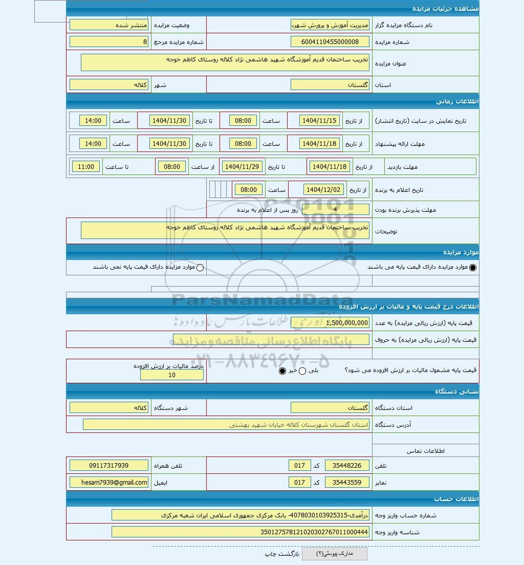 | عنوان مزایده | تخریب ساختمان قدیم آموزشگاه شهید هاشمی نژاد کلاله روستای کاظم خوجه | |||
