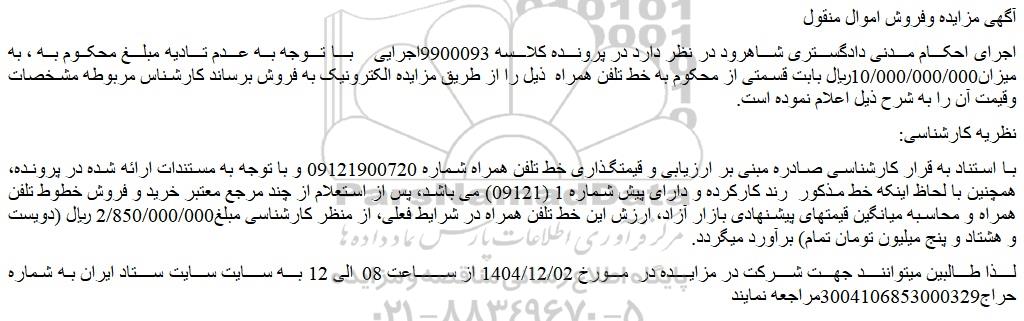 اجرای احکام مدنی دادگستری شاهرود در نظر دارد در پرونده کلاسه 9900093اجرایی با توجه به عدم تادیه مبلغ محکوم به ، به میزان10/000/000/000ریال بابت قسمتی از محکوم به خط تلفن همراه ذیل را از طریق مزایده الکترونیک به فروش برساند کارشناس مربوطه مشخصات وقیمت آن را به شرح ذیل اعلام نموده است.