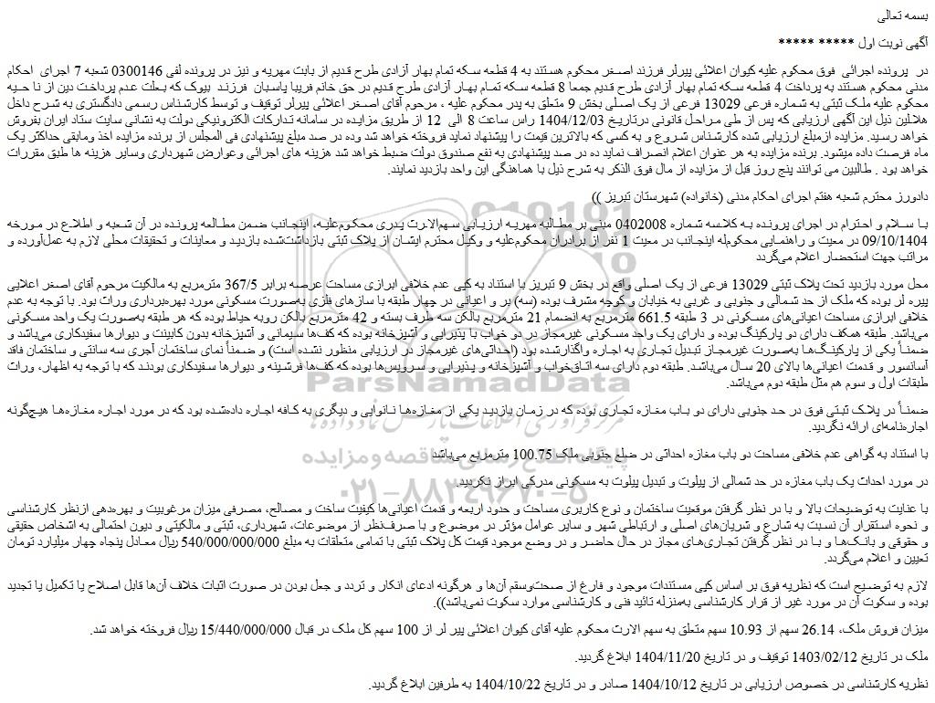 در پرونده اجرائی فوق محکوم علیه کیوان اعلائی پیرلر فرزند اصغر محکوم هستند به 4 قطعه سکه تمام بهار آزادی طرح قدیم از بابت مهریه و نیز در پرونده لفی 0300146 شعبه 7 اجرای احکام مدنی محکوم هستند به پرداخت 4 قطعه سکه تمام بهار آزادی طرح قدیم جمعا 8 قطعه سکه تمام بهار آزادی طرح قدیم در حق خانم فریبا پاسبان فرزند بیوک که بـعلت عـدم پرداخـت دین از نا حــیه محکوم علیه ملک ثبتی به شماره فرعی 13029 فرعی از یک اصلی بخش 9 متعلق به پدر محکوم علیه ، مرحوم آقای اصغر اعلائی پیرلر توقیف و توسط کارشناس رسمی دادگستری به شرح داخل هلالین ذیل این آگهی ارزیابی که پس از طی مـراحـل قانونی درتاریخ 1404/12/03 راس ساعت 8 الی 12 از طریق مزایده در سامانه تدارکات الکترونیکی دولت به نشانی سایت ستاد ایران بفروش خواهد رسید. مزایده ازمبلغ ارزیابی شده کارشناس شروع و به کسی که بالاترین قیمت را پیشنهاد نماید فروخته خواهد شد وده در صد مبلغ پیشنهادی فی المجلس از برنده مزایده اخذ ومابقی حداکثر یک ماه فرصت داده میشود. برنده مزایده به هر عنوان اعلام انصراف نماید ده در صد پیشنهادی به نفع صندوق دولت ضبط خواهد شد هزینه های اجرائی وعوارض شهرداری وسایر هزینه ها طبق مقررات خواهد بود . طالبین می توانند پنج روز قبل از مزایده از مال فوق الذکر به شرح ذیل با هماهنگی این واحد بازدید نمایند.