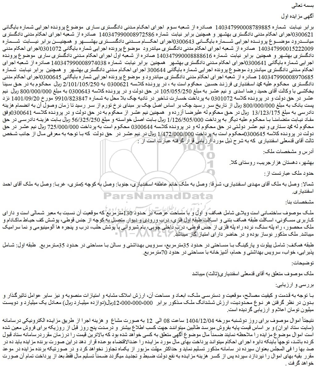 برابر نیابت شماره 140347990008789885 صادره از شعبه سوم اجرای احکام مدنی دادگستری ساری موضوع پرونده اجرایی شماره بایگانی 0300621اجرای احکام مدنی دادگستری بهشهر و همچنین برابر نیابت شماره 140347990008972586 صادره از شعبه اجرای احکام مدنی دادگستری میاندرود موضوع پرونده اجرایی شماره بایگانی 0300643اجرای احکام مدنی دادگستری بهشهر و همچنین برابر نیابت شماره 140347990015222009 صادره از شعبه اجرای احکام مدنی دادگستری میاندرود موضوع پرونده اجرایی شماره بایگانی 0301072اجرای احکام مدنی دادگستری بهشهر و همچنین برابر نیابت شماره 140347990008888616 صادره از شعبه اول اجرای احکام مدنی دادگستری ساری موضوع پرونده اجرایی شماره بایگانی 0300641اجرای احکام مدنی دادگستری بهشهر همچنین برابر نیابت شماره 140347990008974038 صادره از شعبه اجرای احکام مدنی دادگستری میاندرود موضوع پرونده اجرایی شماره بایگانی 300644 اجرای احکام مدنی دادگستری بهشهر و همچنین برابر نیابت شماره 140347990008970685 صادره از شعبه اجرای احکام مدنی دادگستری میاندرود و موضوع پرونده اجرایی شماره بایگانی 0300645اجرای احکام مدنی دادگستری محکوم علیه محمد اسفندیاری فرزند حسین محکوم است به ، در پرونده کلاسه 0300621 به 2/101/105/250 ریال محکوم به در حق سینا یخکشی با وکالت آقای حمید رضا اسدی و نیم عشر به مبلغ 105/055/250 در حق دولت و در پرونده کلاسه 0300643 به مبلغ 800/000/000 ریال نیم عشر در حق دولت و در پرونده کلاسه 0301072 به پرداخت خسارت تاخیر در تادیه چک بلا محل به شماره 9910/823847 مورخ 1401/09/20 نزد پست بانک به مبلغ 800/000/000 ریال از تاریخ سر رسید چک بر اساس اصل چک بر مبنای نرخ تورم از سر رسید تا زمان وصول آن به انضمام هزینه دادرسی به مبلغ 13/123/175 ریال در حق محکوم له علیرضا آزرده و همچنین نیم عشر از محکوم به در حق دولت و در پرونده کلاسه 0300641وفق مفاد نیابت متضامنا با محکوم علیه دیگر به پرداخت 1/126/505/000 ریال بابت اصل خواسته و مبلغ 56/325/250 ریال بابت هزینه دادرسی در حق محکوم له محمد ستاری و نیم عشر دولتی در حق محکوم له و در پرونده کلاسه 0300644 محکوم است به پرداخت 725/000/000 ریال نیم عشر در حق دولت در پرونده کلاسه 0300645محکوم است به پرداخت 1/472/000/000 ریال در نیم عشر در حق دولت که با توجه به معرفی مال از جانب شخص ثالث آقای قدمعلی اسفندیاری که به شرح ذیل مورد ارزیابی قرار گرفته عبارت است از :
