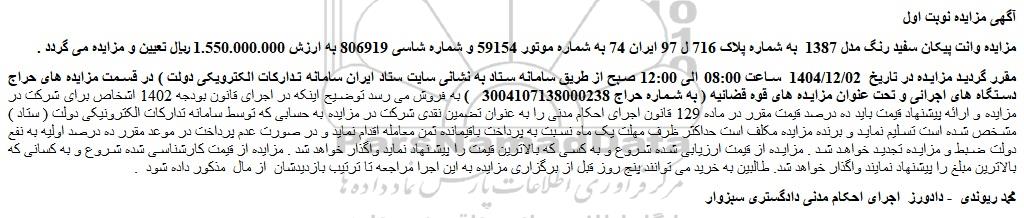 مزایده وانت پیکان سفید رنگ مدل 1387 به شماره پلاک 716 ل 97 ایران 74 به شماره موتور 59154 و شماره شاسی 806919 به ارزش 1.550.000.000 ریال تعیین و مزایده می گردد .
