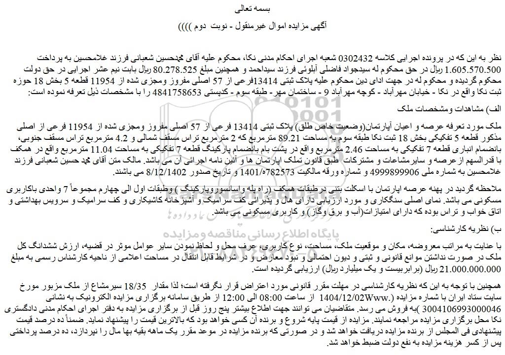 نظر به این که در پرونده اجرایی کلاسه 0302432 شعبه اجرای احکام مدنی نکا، محکوم علیه آقای محمدحسین شعبانی فرزند غلامحسین به پرداخت 1.605.570.500 ریال در حق محکوم له سیدجواد فاضلی آبلوئی فرزند سیداحمد و همچنین مبلغ 80.278.525 ریال بابت نیم عشر اجرایی در حق دولت محکوم گردیده و محکوم له در جهت ادای دین محکوم علیه پلاک ثبتی 13414فرعی از 57 اصلی مفروز ومجزی شده از 11954 قطعه 5 بخش 18 حوزه ثبت نکا واقع در نکا - خیابان مهرآباد - کوچه مهرآباد 9 - ساختمان مهر- طبقه سوم - کدپستی 4841758653 را با مشخصات ذیل تعرفه نموده است: