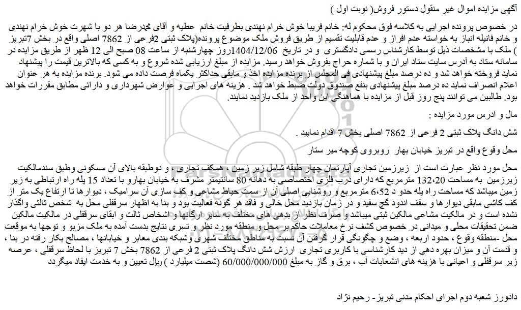 در خصوص پرونده اجرایی به کلاسه فوق محکوم له: خانم فریبا خوش خرام نهندی بطرفیت خانم عطیه و آقای محمدرضا هر دو با شهرت خوش خرام نهندی و خانم فانیله انباز به خواسته عدم افراز و عدم قابلیت تقسیم از طریق فروش ملک موضوع پرونده(پلاک ثبتی 2فرعی از 7862 اصلی واقع در بخش 7تبریز ) ملک با مشخصات ذیل توسط کارشناس رسمی دادگستری و در تاریخ 1404/12/06روز چهارشنبه از ساعت 08 صبح الی 12 ظهر از طریق مزایده در سامانه ستاد به آدرس سایت ستاد ایران و با شماره حراج بفروش خواهد رسید. مزایده از مبلغ ارزیابی شده شروع و به کسی که بالاترین قیمت را پیشنهاد نماید فروخته خواهد شد و ده درصد مبلغ پیشنهادی فی المجلس از برنده مزایده اخذ و مابقی حداکثر یکماه فرصت داده می شود. برنده مزایده به هر عنوان اعلام انصراف نماید ده درصد مبلغ پیشنهادی بنفع صندوق دولت ضبط خواهد شد . هزینه های اجرایی و عوارض شهرداری و دارائی مطابق مقررات خواهد بود. طالبین می توانند پنج روز قبل از مزایده با هماهنگی این واحد از ملک بازدید نمایند.