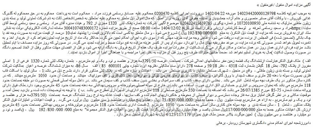 به موجب اجراییه کلاسه 140234420000129798 مورخه 1402/04/22 درپرونده اجرایی کلاسه 0200470 محکوم علیه صادق رستمی فرزند مراد ، محکوم است به پرداخت محکوم به در حق ممحکوم له گلبرگ غذایی کوروش ، با وکالت آقای صابر منصوری و خانم آزاده جمشیدیان و نماینده حقوقی آقای روزبه نوذر اصل که مال/اموال ذیل متعلق به محکوم علیه /متعللق به شخص/اشخاص ثالث به نام شرکت تعاونی تولید و بسته بندی زیتون طلایی مارلیک به شناسه ملی 10720100950 و شماره پیگیری 020422415659765 موضوع آگهی شرکت به شماره پلاک ثبتی 1320 مجزی از 792 و هیات مدیره آقای مراد رستمی و سعید رستمی توسط آقای مراد و سعید رستمی تعرفه و توسط کارشناس ارزیابی و قرار است در تاریخ 1404/12/02 ساعت 08:00 صبح از طریق مزایده شماره 3004107483000172 سامانه تدارکات الکترونیکی دولت به نشانی سایت ستاد ایران به فروش برسد که مزایده از قیمت ذیل الذکر(، به مبلغ 192/830/000/000 ریال ) شروع می شود ، و مال متعلق به کسی است که بالاترین قیمت را پیشنهاد نماید10 درصد از قیمت مزایده به صورت وجه نقد یا چک بانکی (تضمین شده) فی المجلس از برنده مزایده دریافت می شود و مابقی وجه مزایده ظرف مهلتی که از سوی دایره اجرای احکام تعیین می گردد حداکثر یک ماه از تاریخ مزایده تجاوزنخواهد کرد از خریدار اخذ و به نامبرده تحویل خواهد شددر صورتی که برنده مزایده در موعد مقرربقیه بهای مال را نپردازد سپرده او پس از کسر هزینه مزایده به نفع دولت ضبط و مزایده تجدید می گردد. در صورتی که روز مزایده مصادف با ایام تعطیل باشد مزایده فردای اداری همان روز در همان ساعت و مکان برگزار می گردد،شکایت از مقررات مزایده ظرف یک هفته از تاریخ فروش به دادگاه ارایه می شود و قبل از انقضای مهلت مذکور وقبل از اتخاذ تصمیم دادگاه در صورت وصول شکایت )مال به خریدار تسلیم نخواهد شد ،ضمناً طالبین میتوانند ظرف پنج روز قبل از مزایده به دفتر اجرا مراجعه و با هماهنگی اجرا از اموال بازدید نمایند./