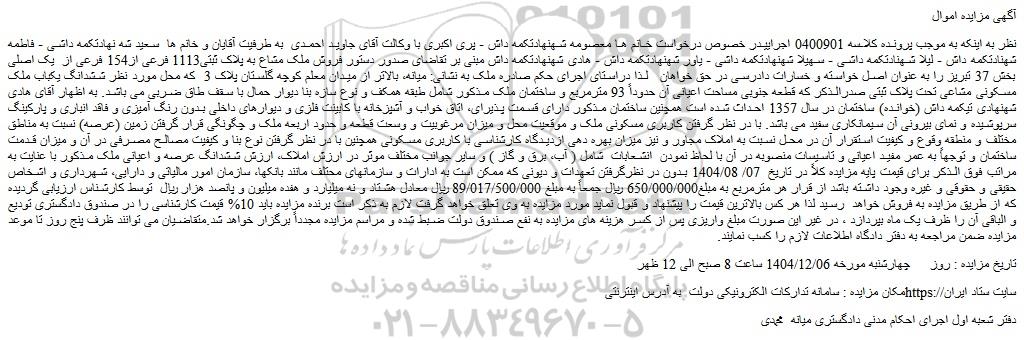 نظر به اینکه به موجب پرونده کلاسه 0400901 اجراییدر خصوص درخواست خانم ها معصومه شهنهادتکمه داش - پری اکبری با وکالت آقای جاوید احمدی به طرفیت آقایان و خانم ها سعید شه نهادتکمه داشی - فاطمه شهنادتکمه داش - لیلا شهنادتکمه داشی - سهیلا شهنهادتکمه داشی - یاور شهنهادتکمه داش - هادی شهنهادتکمه داش مبنی بر تقاضای صدور دستور فروش ملک مشاع به پلاک ثبتی1113 فرعی از154 فرعی از یک اصلی بخش 37 تبریز را به عنوان اصل خواسته و خسارات دادرسی در حق خواهان لذا دراستای اجرای حکم صادره ملک به نشانی: میانه، بالاتر از میدان معلم کوچه گلستان پلاک 3 که محل مورد نظر ششدانگ یکباب ملک مسکونی مشاعی تحت پلاک ثبتی صدرالذکر که قطعه جنوبی مساحت اعیانی آن حدوداً 93 مترمربع و ساختمان ملک مذکور شامل طبقه همکف و نوع سازه بنا دیوار حمال با سقف طاق ضربی می باشد. به اظهار آقای هادی شهنهادی تیکمه داش (خوانده) ساختمان در سال 1357 احداث شده است همچنین ساختمان مذکور دارای قسمت پذیرای، اتاق خواب و آشپزخانه با کابینت فلزی و دیوارهای داخلی بدون رنگ آمیزی و فاقد انباری و پارکینگ سرپوشیده و نمای بیرونی آن سیمانکاری سفید می باشد. با در نظر گرفتن کاربری مسکونی ملک و موقعیت محل و میزان مرغوبیت و وسعت قطعه و حدود اربعه ملک و چگونگی قرار گرفتن زمین (عرصه) نسبت به مناطق مختلف و منطقه وقوع و کیفیت استقرار آن در محل نسبت به املاک مجاور و نیز میزان بهره دهی ازدیدگاه کارشناسی با کاربری مسکونی همچنین با در نظر گرفتن نوع بنا و کیفیت مصالح مصرفی در آن و میزان قدمت ساختمان و توجهاً به عمر مفید اعیانی و تاسیسات منصوبه در آن با لحاظ نمودن انشعابات شامل ( آب، برق و گاز ) و سایر جوانب مختلف موثر در ارزش املاک، ارزش ششدانگ عرصه و اعیانی ملک مذکور با عنایت به مراتب فوق الذکر برای قیمت پایه مزایده کلاً در تاریخ 07/ 1404/08 بدون در نظرگرفتن تعهدات و دیونی که ممکن است به ادارات و سازمانهای محتلف مانند بانکها، سازمان امور مالیاتی و دارایی، شهرداری و اشخاص حقیقی و حقوقی و غیره وجود داشته باشد از قرار هر مترمربع به مبلغ650/000/000 ریال جمعاً به مبلغ 89/017/500/000 ریال معادل هشتاد و نه میلیارد و هفده میلیون و پانصد هزار ریال توسط کارشناس ارزیابی گردیده که از طریق مزایده به فروش خواهد رسید لذا هر کس بالاترین قیمت را پیشنهاد و قبول نماید مورد مزایده به وی تعلق خواهد گرفت لازم به ذکر است برنده مزایده باید 10% قیمت کارشناسی را در صندوق دادگستری تودیع و الباقی آن را ظرف یک ماه بپردازد ، در غیر این صورت مبلغ واریزی پس از کسر هزینه های مزایده به نفع صندوق دولت ضبط شده و مراسم مزایده مجدداً برگزار خواهد شد.متقاضیان می توانند ظرف پنج روز تا موعد مزایده ضمن مراجعه به دفتر دادگاه اطلاعات لازم را کسب نمایند.