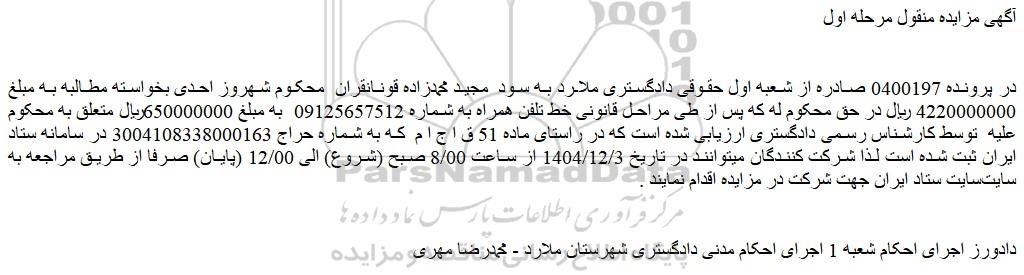 در پرونده 0400197 صادره از شعبه اول حقوقی دادگستری ملارد به سود  مجید محمدزاده قونانقران  محکوم شهروز احدی بخواسته مطالبه به مبلغ 4220000000 ریال در حق محکوم له که پس از طی مراحل قانونی خط تلفن همراه به شماره 09125657512  به مبلغ 650000000ریال متعلق به محکوم علیه  توسط کارشناس رسمی دادگستری ارزیابی شده است که در راستای ماده 51 ق ا ج ا م  که به شماره حراج 3004108338000163 در سامانه ستاد ایران ثبت شده است لذا شرکت کنندگان میتوانند در تاریخ 1404/12/3 از ساعت 8/00 صبح (شروع) الی 12/00 (پایان) صرفا از طریق مراجعه به سایتسایت ستاد ایران جهت شرکت در مزایده اقدام نمایند .