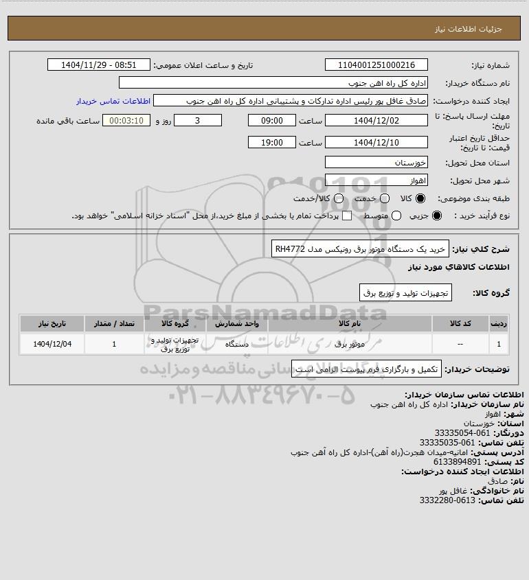 نام دستگاه خریدار:اداره کل راه اهن جنوب