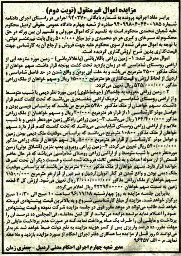 مزایده اموال غیرمنقول شامل زمین زراعی نوبت دوم کلاسه 940370
