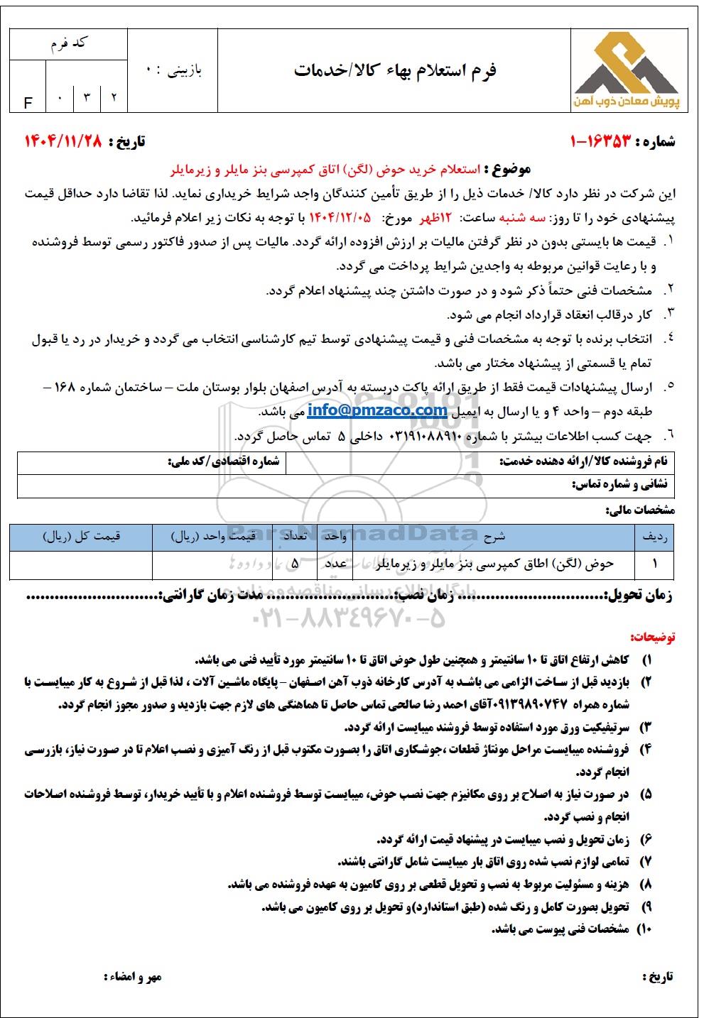 این شرکت در نظر دارد کالا/ خدمات ذیل را از طریق تأمین کنندگان واجد شرایط خریداری نماید. لذا تقاضا دارد حداقل قیمت پیشنهادی خود را تا روز: سه شنبه ساعت 12 ظهر مورخ: 1404.12.05 با توجه به نکات زیر اعلام فرمائید.