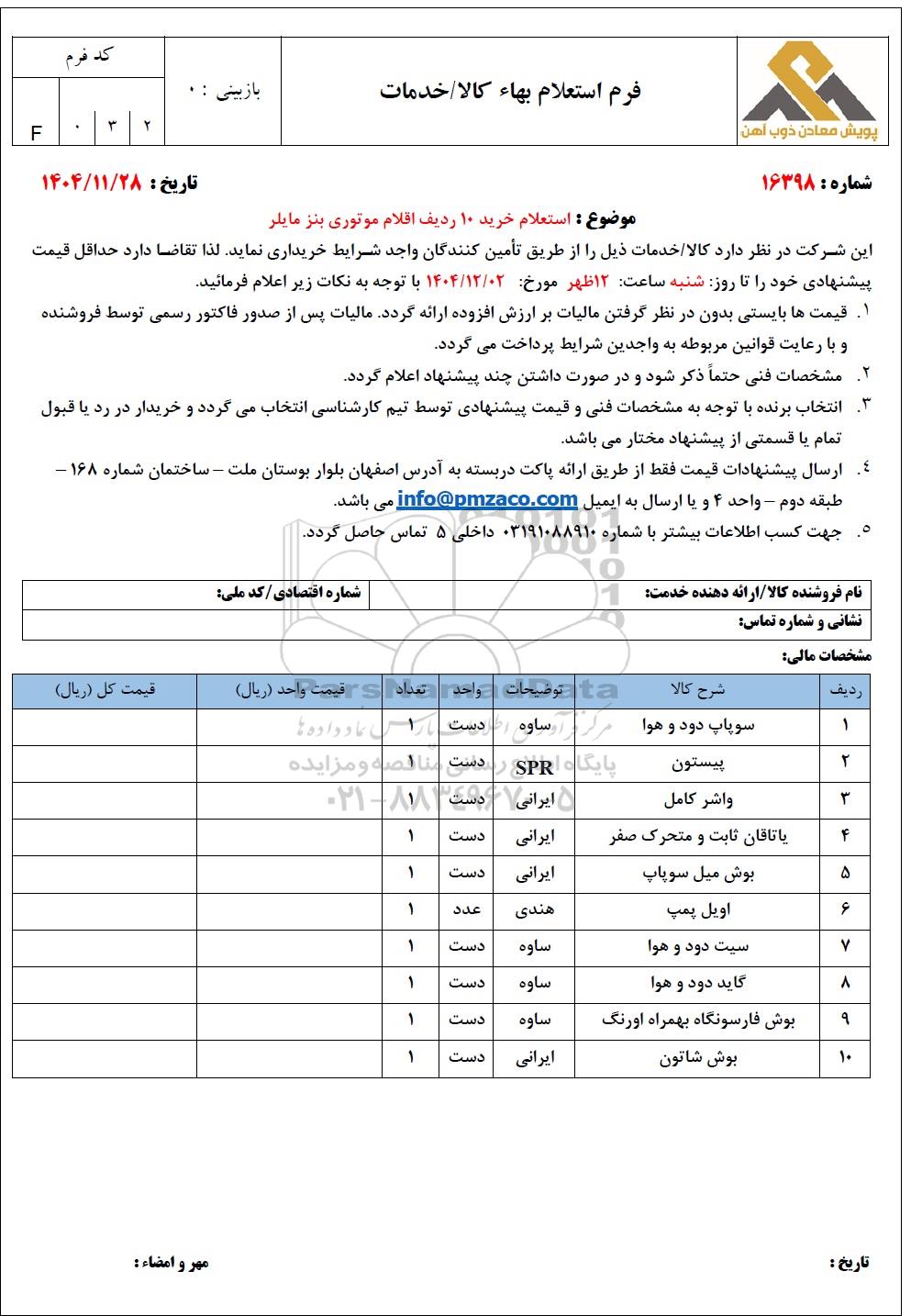 موضوع: استعلام خرید 10 ردیف اقلام موتوری بنز مایلر