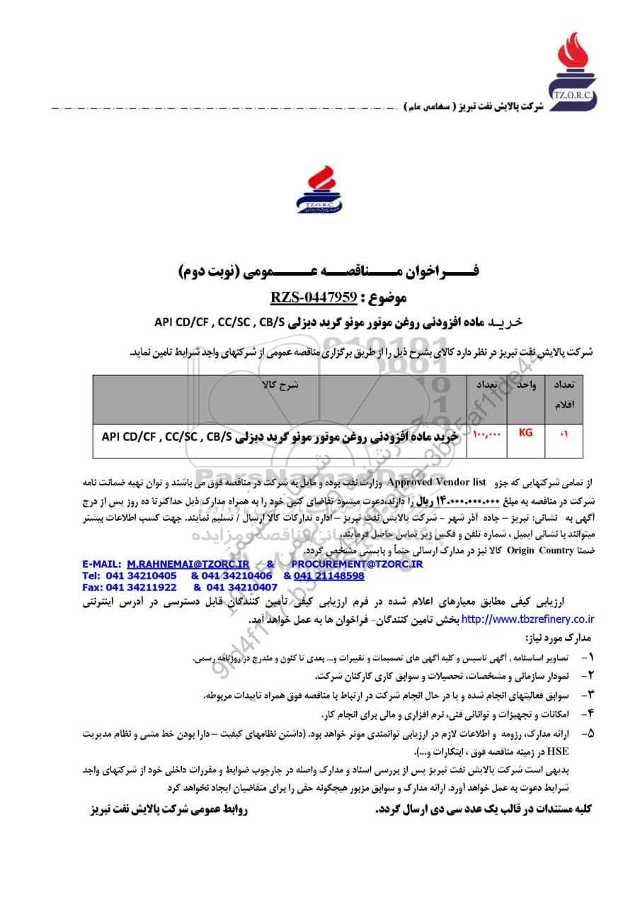 مناقصه خرید ماده افزودنی روغن موتور مونو گرید دیزلی API CD/ CF, CC/SC , CB/S - نوبت دوم -مناقصه روز چهارشنبه بیست و نهم بهمن ماه 1404 از کلیه افراد متخصص و شرکتها واجد شرایط دعوت به عمل میآید در مناقصه با کد خبرگزاری پارس نماد: 10329653 شرکت نمایند.