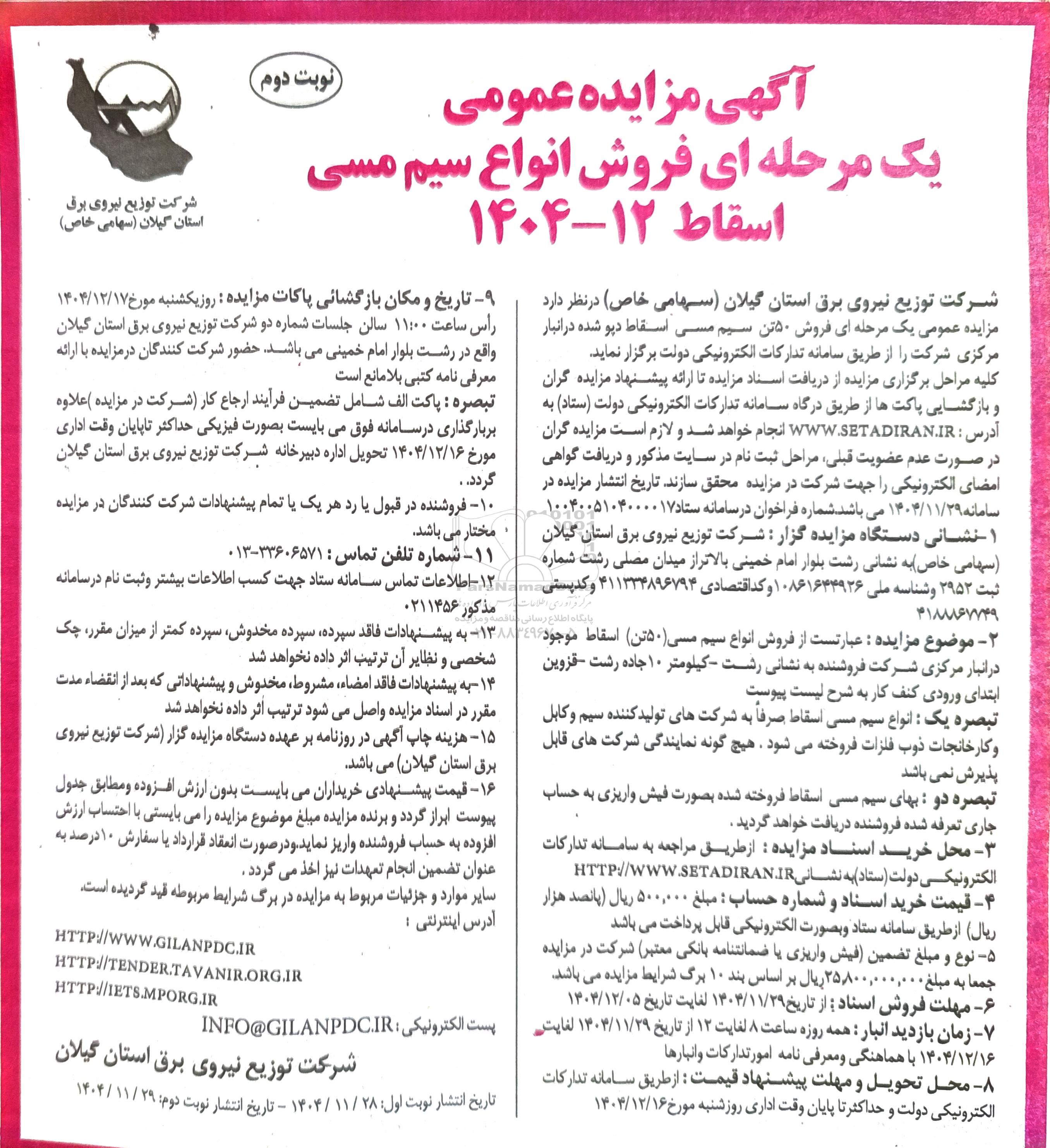 شرکت توزیع نیروی برق استان گیلان (سهامی خاص) در نظر دارد مزایده عمومی یک مرحله ای فروش 50 تن سیم مسی اسقاط دپو شده در انبار مرکزی شرکت را از طریق سامانه تدارکات الکترونیکی دولت برگزار نماید کلیه مراحل برگزاری مزایده از دریافت اسناد مزایده تا ارائه پیشنهاد مزایده گران و بازگشایی پاکت ها از طریق درگاه سامانه تدارکات الکترونیکی دولت (ستاد) به آدرس ستاد ایران  انجام خواهد شد و لازم است مزایده گران در صورت عدم عضویت قبلی مراحل ثبت نام در سایت مذکور و دریافت گواهی امضای الکترونیکی را جهت شرکت در مزایده محقق سازند.