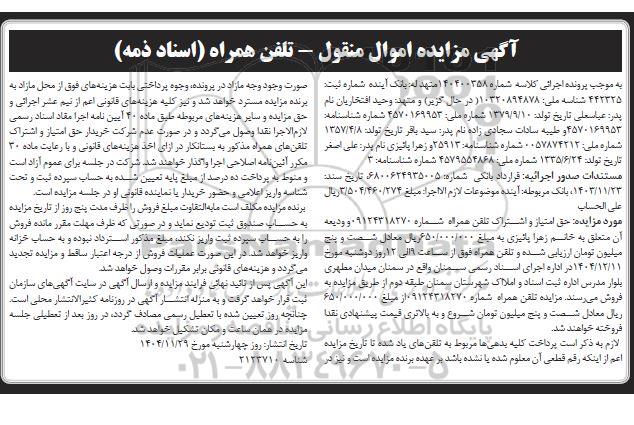 آگهی مزایده اموال منقول - تلفن همراه اسناد ذمه