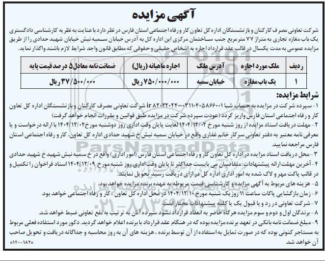شرکت تعاونی مصرف کارکنان و بازنشستگان اداره کل تعاون کار و رفاه اجتماعی استان فارس در نظر دارد با عنایت به نظریه کارشناسی دادگستری یک باب مغازه تجاری به متراژ 77 مترمربع جنب ساختمان مرکزی این اداره کل به آدرس خیابان سمیه نبش خیابان شهید حدادی را از طریق مزایده عمومی به مدت یک سال در قالب عقد قرارداد اجاره به اشخاص حقیقی و حقوقی که مطابق قانون واجد شرایط لازم باشند واگذار نماید.