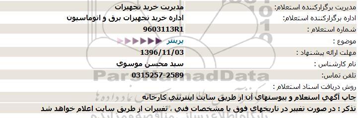 استعلام بها و موضوع استعلام استعلام ,استعلام پرینتر به اطلاع کلیه شرکتها و افراد متخصص واجد شرایط میرساند، آگهی گذار در نظر دارد از طریق استعلام بها، نسبت به انتخاب و دریافت پیشنهادات اقدام نماید. این استعلام با کد آگهی ثبت شده در سامانه خبرگزاری پارس نماد : 1033125 منتشر شده است. مشخصات استعلام : تاریخ شروع استعلام: 1396/11/02 آخرین مهلت ارسال پیشنهاد قیمت : 1396/11/03 و محل اجرای پروژه : استان اصفهان میباشد. استعلام قیمت مورد درخواست : استعلام ,استعلام پرینتر با دستهبندیهای تخصصی و گروه های مرتبط : کامپیوتر, ماشین اداری, استعلام اطلاع رسانی میگردد.