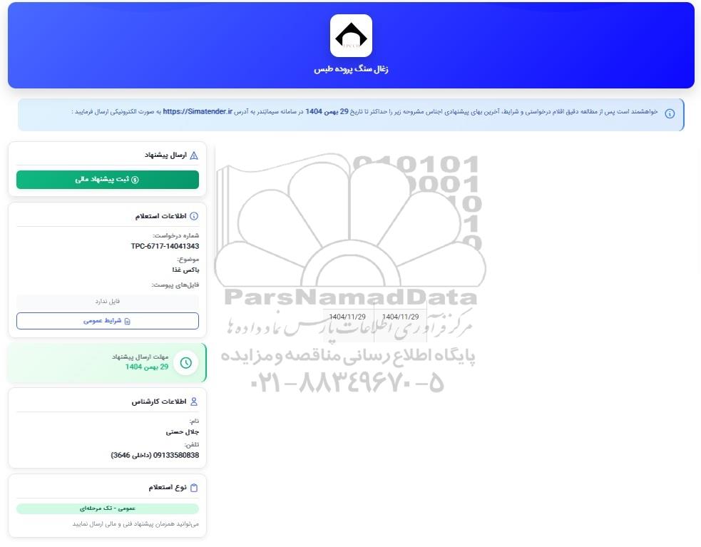 استعلام بها و موضوع استعلام استعلام باکس غذا به اطلاع کلیه شرکتها و افراد متخصص واجد شرایط میرساند، آگهی گذار در نظر دارد از طریق استعلام بها، نسبت به انتخاب و دریافت پیشنهادات اقدام نماید. این استعلام با کد آگهی ثبت شده در سامانه خبرگزاری پارس نماد : 10331268 منتشر شده است. مشخصات استعلام : تاریخ شروع استعلام: 1404/11/29 آخرین مهلت ارسال پیشنهاد قیمت : 1404/11/29 و محل اجرای پروژه : استان مناقصات استان خراسان جنوبی میباشد. استعلام قیمت مورد درخواست : استعلام باکس غذا با دستهبندیهای تخصصی و گروه های مرتبط : تجهیزات آشپزخانه, استعلام اطلاع رسانی میگردد.