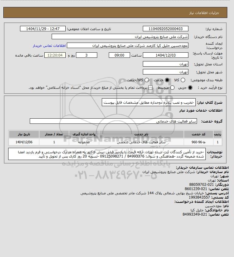 شرح کلی نیاز: -تخریب و نصب پنجره دوجداره مطابق مشخصات فایل پیوست