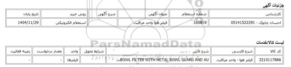 احسان چابوک - 05141522291165819فیلتر هوا واحد مراقبتاستعلام الکترونیکی1404/11/29