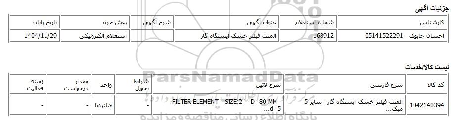 | احسان چابوک - 05141522291 | 168912 | المنت فیلتر خشک ایستگاه گاز | استعلام الکترونیکی | 1404/11/29 |