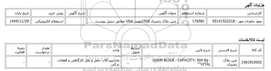 | محمد جاودان مهر - 05141522318 | 176581 | چین بلاک زنجیری 500کیلویی Vital مطابق دیتیل پیوست | استعلام الکترونیکی | 1404/11/29 |