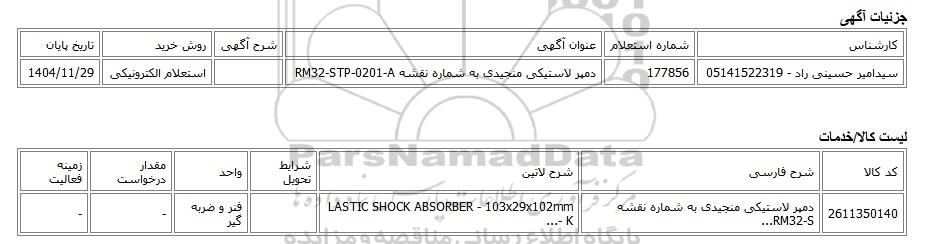 | سیدامیر حسینی راد - 05141522319 | 177856 | دمپر لاستیکی منجیدی به شماره نقشه RM32-STP-0201-A | استعلام الکترونیکی | 1404/11/29 |