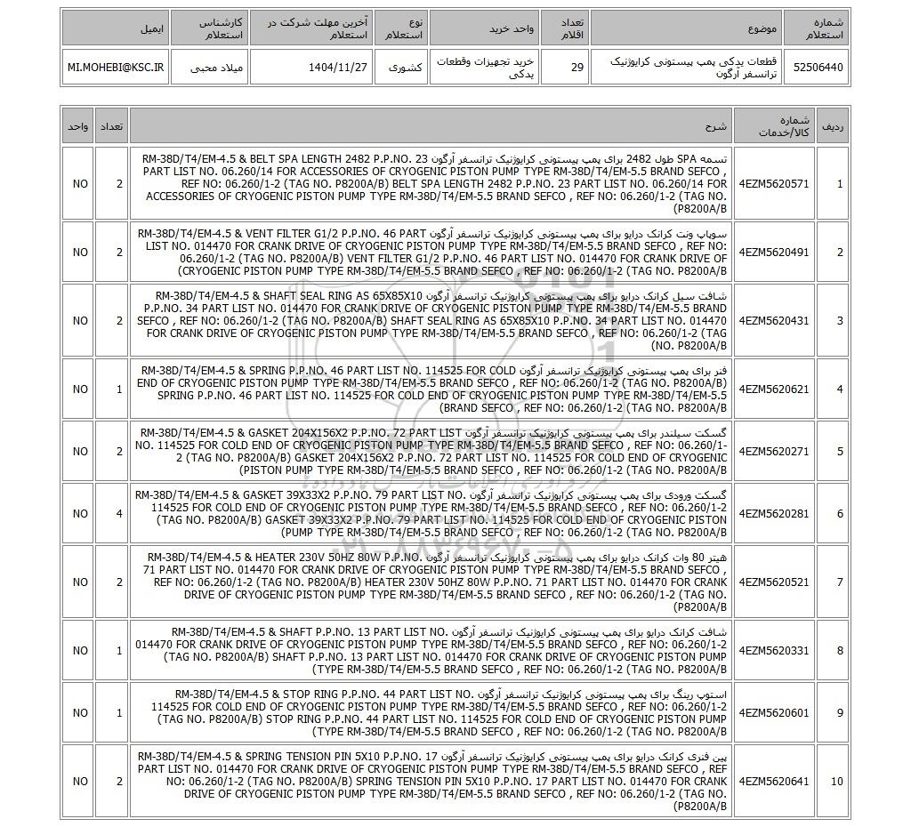 | 52506440 | قطعات یدکی پمپ پیستونی کرایوژنیک ترانسفر آرگون | 29 | خرید تجهیزات وقطعات یدکی | کشوری | 1404/11/27 | میلاد محبی | MI.MOHEBI@KSC.IR |