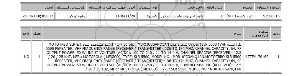| 52508015 | تکرار کننده (VHF) | 1 | خرید تجهیزات وقطعات یدکی | کشوری | 1404/11/29 | زهره اورکی | ZO.ORAKI@KSC.IR |