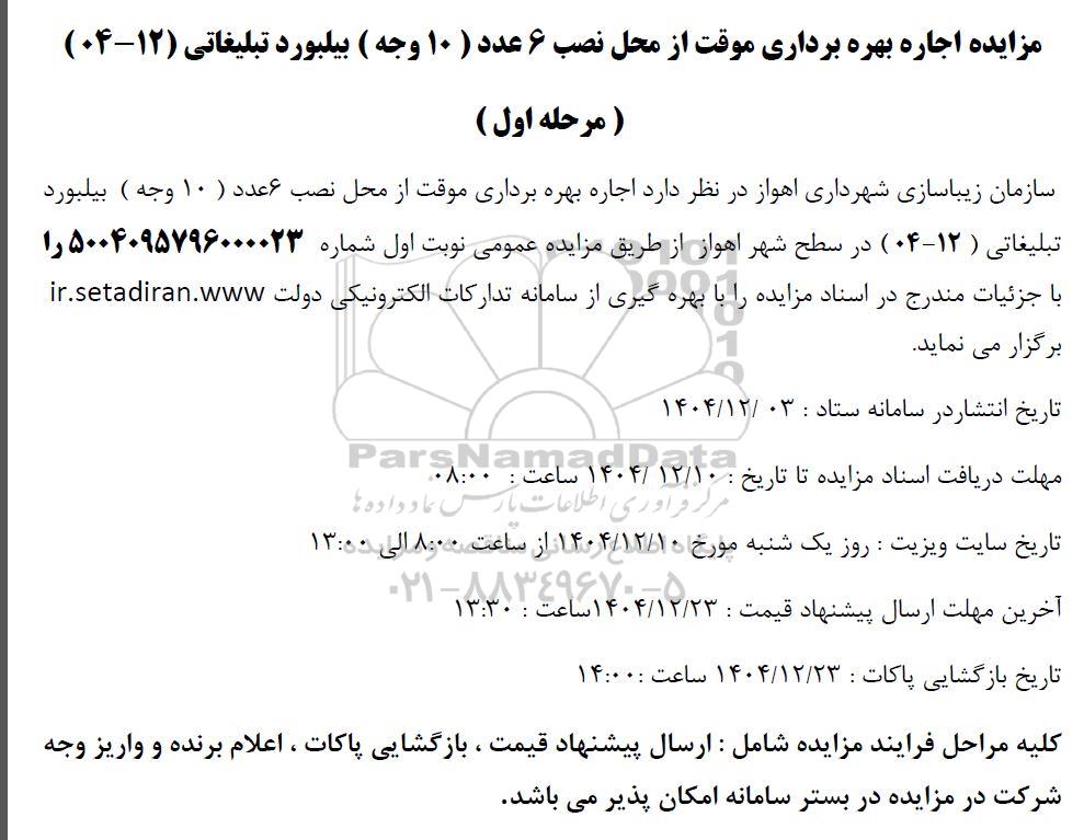 مزایده عمومی مزایده اجاره بهره برداری موقت از محل نصب 6 عدد ( 10 وجه ) بیلبورد تبلیغاتی (12-04)-مزایده روز پنجشنبه سی ام بهمن ماه 1404 برگزار میگردد. از کلیه افراد متخصص و شرکتهای واجد شرایط دعوت به عمل میآید تا در این مزایده با کد خبرگزاری پارس نماد : 10334247 شرکت نمایند تاریخ شروع مزایده : 1404/12/02 مهلت شرکت در مزایده: تا پایان روز 1404/12/10 مکان برگزاری اموال واگذاری استانهای مزایدات استان خوزستان و دستهبندیهای مربوط به این حراجی طراحی و چاپ میباشد.