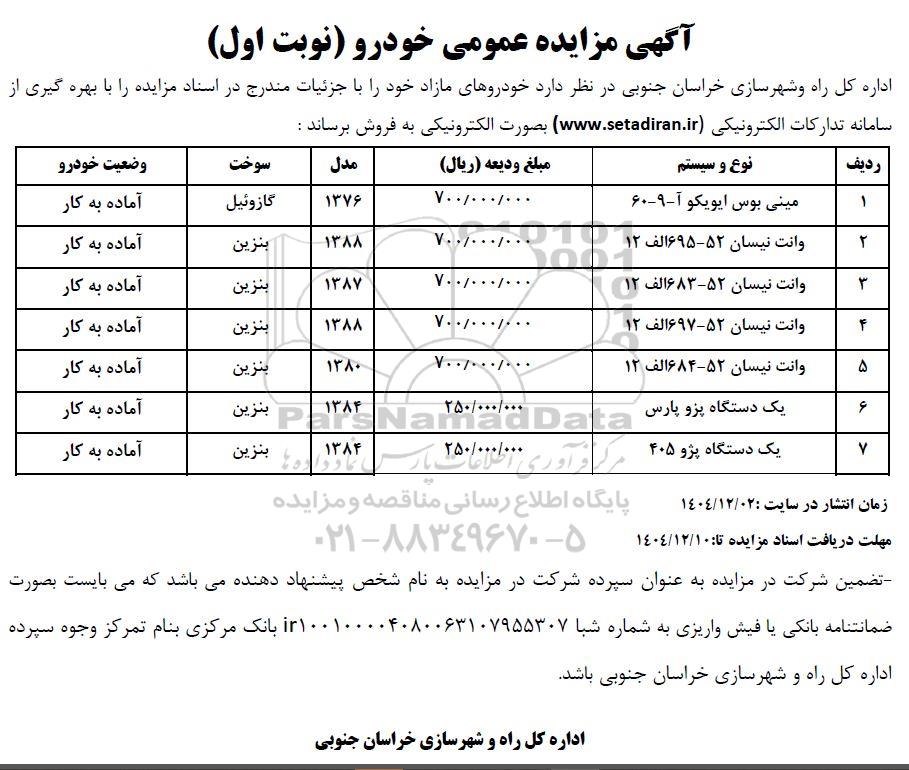 اداره کل راه و شهرسازی خراسان جنوبی در نظر دارد خودروهای مازاد خود را با جزئیات مندرج در اسناد مزایده را با بهره گیری از سامانه تدارکات الکترونیکی ستاد ایران بصورت الکترونیکی به فروش برساند :