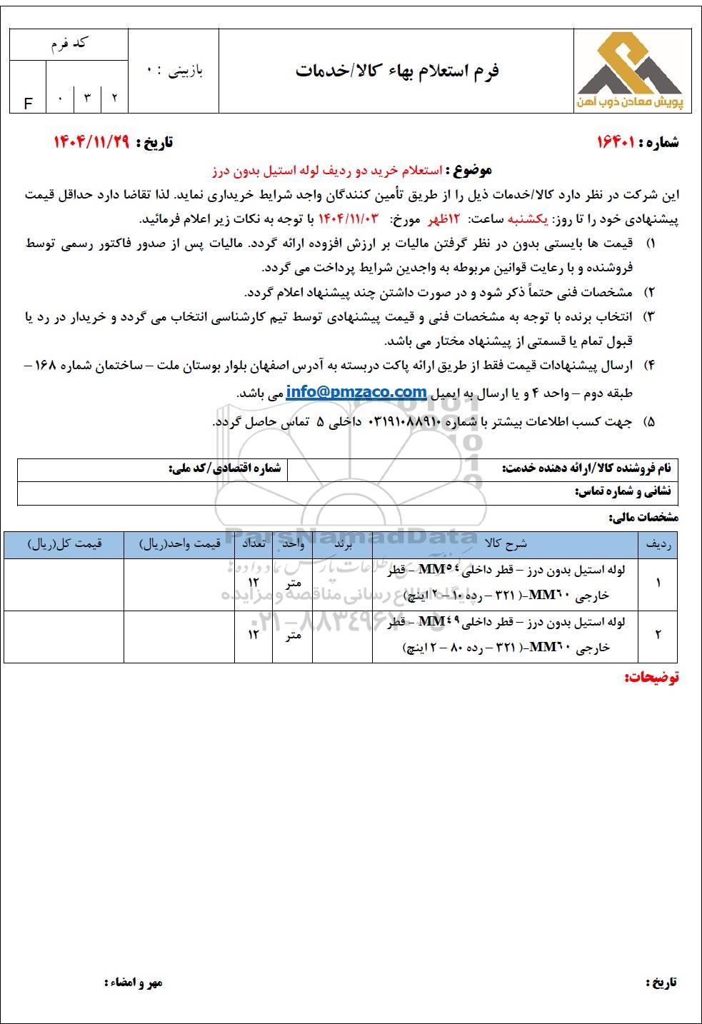موضوع: استعلام خرید دو ردیف لوله استیل بدون درز