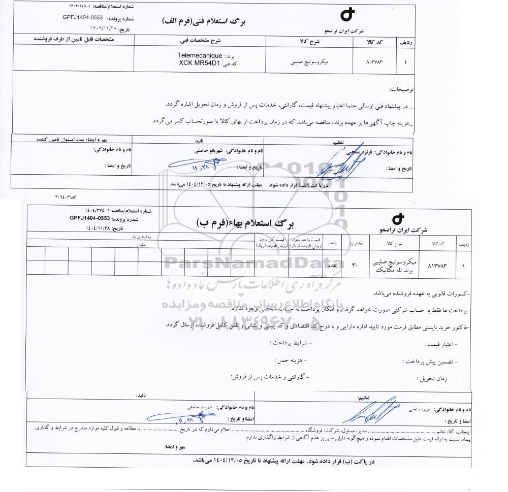 - در پیشنهاد فنی ارسالی حتما اعتبار پیشنهاد قیمت، گارانتی، خدمات پس از فروش و زمان تحویل اشاره گردد.