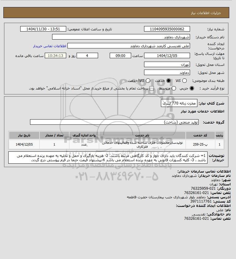 شرح کلی نیاز: مخزن زباله 770 لیتری