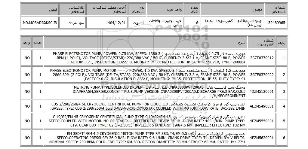 | 52489965 | توربوماشینها(فنها - کمپرسورها - پمپها - توربین ها) | 6 | خرید تجهیزات وقطعات یدکی | کشوری | 1404/12/01 | محمد مرادی | MD.MORADI@KSC.IR |