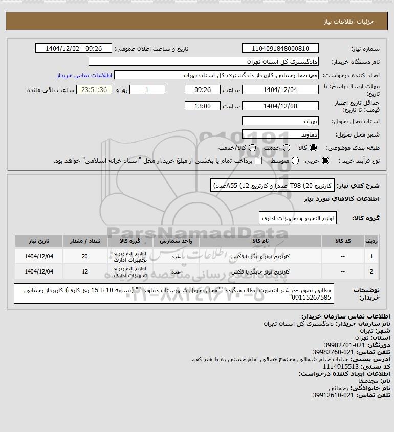 | 2 | -- | کارتریج تونر چاپگر یا فکس | عدد | لوازم التحریر و تجهیزات اداری | 12 | 1404/12/04 |
